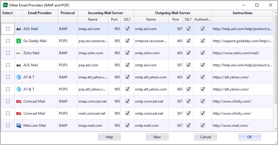 If you don’t see your email provide in this list above, you can manually enter your provider information. Click on the “New” button at the bottom of this screen. Enter your provider’s email server information in the screen that opens.